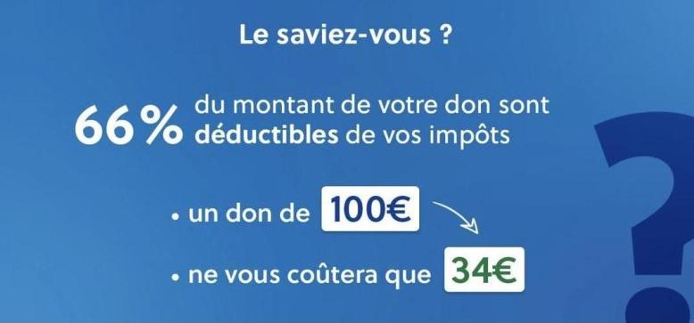 Selon l’article 200 du code général des impôts, 66 % du montant de votre don est déductible de l’impôt sur le revenu.